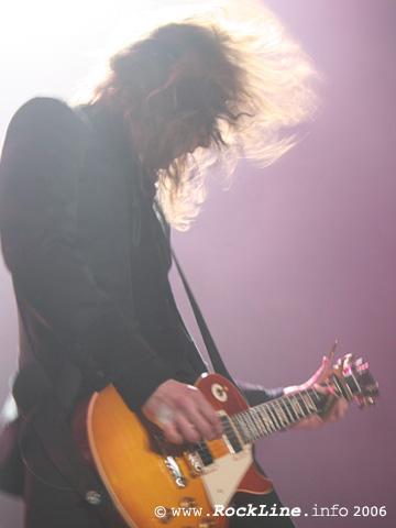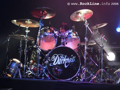 Justin je prepričljivo pel in vlekel melodijo skozi nenormalno visoke linije, ko pomisliš, da je to mogoče pač le kadar te nekdo dobro stisne za jajca. Že res, da se je medtem Freddy Mercury verjetno divje obračal v grobu, vendar pa je Justin na odru prepričljivo pokazal, da je resnično popolnoma profesionalno pri stvari. Dec ima karizmo in je nabit z energijo. Oder ga je povsod bil poln. “Riffal” je, odsoliral večino solaž, igral klaviature, ter pel s polnim zaletom. Vsemu temu je dodal okusno mero “štosiranja”, ob katerem se prisotni resnično niso mogli zadrževati, da jih ob tem ne bi slučajno preplavljale salve smeha. The Darkness katerih prva dva albuma slovita po tem, da sta oba dolga skupaj komaj dobro uro, so komade prefinjeno razvlekli z vključitvijo skečev. Tako so v srednje inštrumentalne dele vključili prave dodatne odrske točke. Npr. Justin je vključil v inštrumentalni del, sredi komada, ki ga je zaznamoval pravi rockovski drvež, glavno melodijo “Odiseja 2000 v vesolju”, z izbranim zvokom klaviatur, ki bi sodil naravnost v kakšno “Looney Tunes” risanko, enako finto pa si je privoščil ob vključku glavnega motiva Toccata & Fugue od J.S. Bacha. Poleg tega tudi drugi niso dosti zaostajali za njim kar se tega tiče podobnih norčevanj in Dan je npr. sredi Highway to Hell pričel igrati Wine And Flowers. Koncert je kar prehitro tekel. Dan in Justin sta izmenjala kopico Gibson in Fender kitar na odru, med vsemi kitarami v Justinovih rokah, pa se je znašla tudi Ibanez modela Steve Vai, ostudno ogabne barvne kombinacije, ki je pač k “šminkerskem imageju” sodila. Bljak, še vedno mi ne gredo iz glave njeni nagravžni magneti kričečih, flourescentno oranžnih, barv.