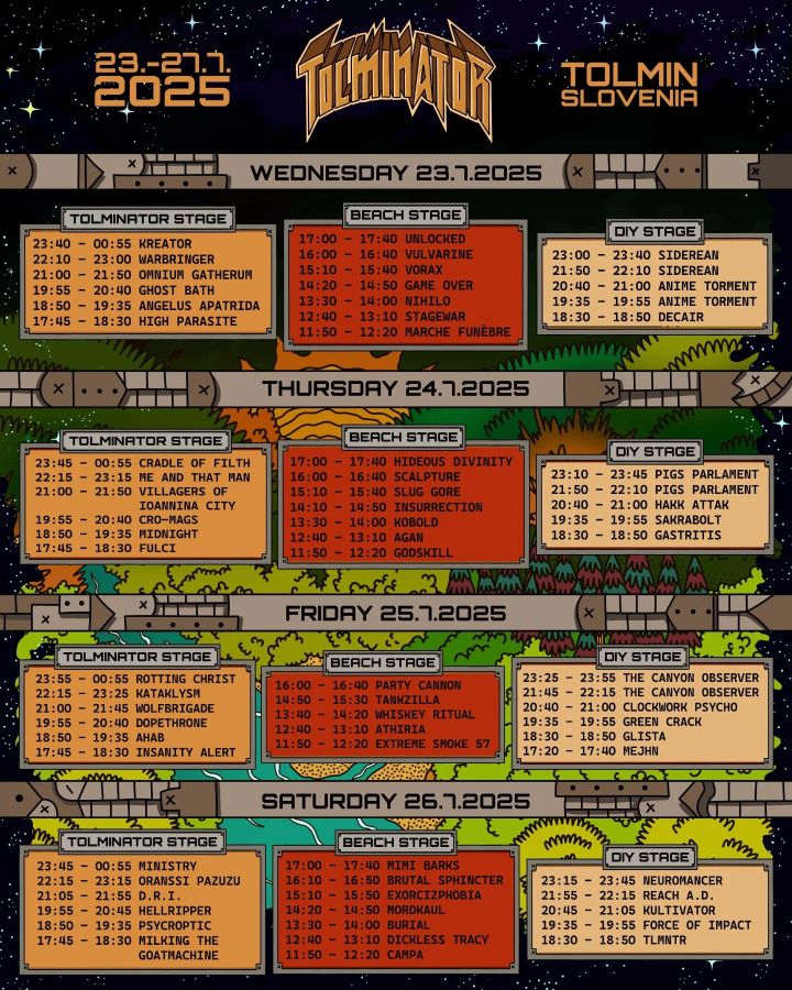 Tolminator 2025 Metal Fest, ki bo potekal v letošnjem letu med 23. 7. 2025 in 27. 7. 2025 na standardni lokaciji sotočja Tolminke in Soče pri Tolminu, objavlja dokončen dnevni in urni razpored nastopajočih skupin!
