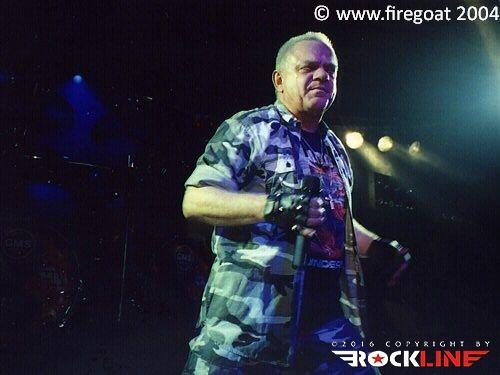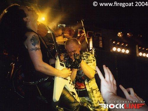 At around 10 p.m. everything was set for legendary Accept singer and his gang to run their show. Taped intro, and here they are. U.D.O. went straight to the core of their latest studio effort “Thunderball” (2004) and same titled hard hitting speedy opener. Udo was dressed in a specially designed long shining cape wearing dark glasses. After huge cheers, band continued with newest stuff, as Udo changed shiny clothes for more standard one, looking like deserted general, freshly escaped from Iraq cavalry. Crowd, well I think there were about 300 people, which began to respond even louder as band continued with first Accept classic Metal Heart (“Metal Heart”, 1985). Accept legacy represents half of a whole U.D.O. live performances on their recent tours. Right after that song one of my U.D.O. favourites was about to rumble. It was Independence Day from U.D.O. “Solid” (1997) album. Udo approached even angrier! Crowd was by then completely into it, waving hands up high in the air and producing at same time real huge noise. Small crowd, but highly devoted, and band felt that. Atmospheric song with very sad chorus was a splendid choice to change a mood a bit. I am always waiting here for Udo to pronounce spine tingling sharp “R” in “….RRRRRRobotic rage…” verse, which creates always a short jump off into new different climax. First part of a gig was consisted mainly from songs that appear on “Thunderball” album. Ending first part of a gig with mid tempo Blind Eyes was to deliver another change of atmosphere that was graduating throughout this song. Even though I still haven’t purchased “Thunderball” album, I was astonished over this song. Phenomenal contrast between heavy mid tempo Fitty’s bass drive that was really cutting through concrete here, and than on the other hand with unique Udo’s singing, while guitars were pushed a bit behind, in order to hold atmosphere on a higher level. First part of a gig ended with drum solo that was fuckin’ loud demonstration of Lorenzo’s killing speed on his double foot bass drum pedals, accompanied with loads of detonating fast break rollings. It was yet another breathtaking lesson.