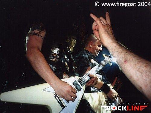 Gremo nazaj. Narod je bil v ekstazi, hipnotizirano je prepevala dvorana “oooh-oooh-e” vzete iz Balls To The Wall, ki je še kar odzvanjala v ušesih. Tudi potem, ko je Kaufman prišel nazaj na oder in začel igrati intro k Holy (“Holy”, 1999), se občinstvo ni kaj prida zmenilo in se v svojem prepevanju ni pustilo motiti. No, ko pa se je prikazal na odru še Udo z ostalimi, se je tudi narod prebudil iz hipnotičnega stanja. Udo je bil za to priložnost odet v župnika s sončnimi očali. Ejga, zakon! Sprva sem pomislil, da je na odru Nosferatu, ki ga igra Klaus Kinski. Sploh je “Holy” moj najljubši U.D.O. album in padel sem v tak delirij, da sem celo skušal v verzu “raise your hands” oponašati Udov vokal. V trenutku sem ostal brez glasu. Vročina je znova naraščala, U.D.O. so prestavili “v višjo” z Accept klasikama I’m A Rebel (“I’m A Rebel”, 1980) in najbolj hrupno, najbolj khm, da ne rečem noro, skratka pesem samih superlativov, lekcijo prave metalske agresije, hrupa in nezadržnega besa v najhitrejši pesmi set liste Fast As A Shark (“Restless And Wild”, 1982). U.D.O. so se poslovili drugič, narod pa je vztrajal in dobil še drugi bis. Skupina je ostala pri omenjeni Accept plošči in pričela drugi dodatek s srednje hitro obskurno a epsko Princess Of The Dawn, ki so jo U.D.O. izvedli v verziji, katera se nahaja na njihovi živi plošči “Nailed To Metal” (2003). Z eno besedo vrhunsko! Presenečenje za konec je bila nedvomno vključitev pesmi Burning, ki je U.D.O. na marčevskih in aprilskih koncertih svoje Thunderball World Tour niso vključevali v set listo. Udo povpraša prisotne: “Do you want us to play another one?” Odgovor je bil huronski “Yeah!!!”, nakar Udo zamahne z roke, češ: “Ste pa nemogoči, kaj še nimate dovolj?” in nadaljuje: “All right Ljubljana! Are you ready to rock? Are you ready to roll?” in tako je odjeknila v noč še ena Accept klasika, ki je zaokrožila ta fenomenalni nepozabni dogodek oživljanja Accept magije, ki je trajal dobri dve uri. Ljudem se je popolnoma zmešalo. Da slovenska metalska publika ne pozna meja, priča nekaj krepkih prask, ki sem jih med koncertom dobil za spomin. Parkrat bi mi skoraj sploščilo moda, ker so se manijaki od zadaj zaletavali v prednjo vrsto. Po vratu sem bil ves porezan, ker se je nek norec po koncertu stegoval prek mene v upanju, da bo dobil kakšno trzalico, da ne govorim o stolčenem komolcu. Preživeti metal koncert v Sloveniji postaja zame očitno iz leta v leto vse težja preizkušnja. Prepotuješ skoraj pol sveta in se izpostavljaš razno raznim divjim situacijam, vse venomer teče brez težav, potem pa se ti zgodi “pizdarija” kot nalašč na koncertu v Sloveniji. Med koncertom Grave Digger mi je npr. nek kreten na parkirišču pred dvorano odtrgal prednjo registrsko tablico iz avta. No to pot, pa sem odšel domov s celim kupom odrgnin.