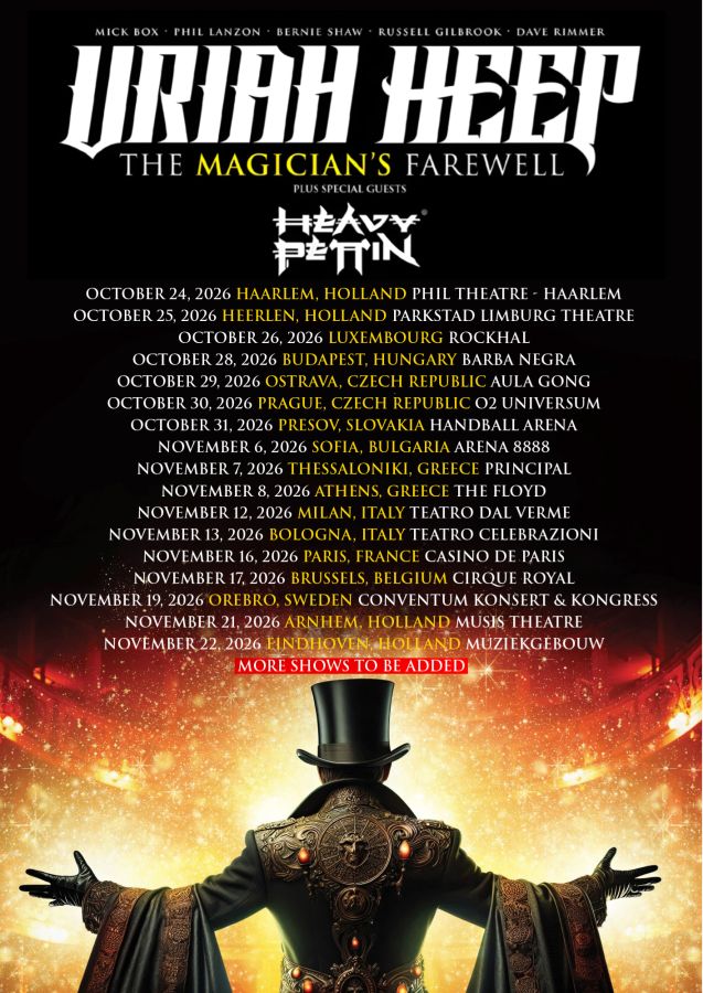 Uriah Heep, britanske rock legende, najavljajo datume naslednjega dela njihove koncertne turneje “The Magician’s Farewell”, s katero bodo v letošnji jeseni znova obiskovali evropske odre. Turneja bo potekala skozi oktober in november. Začela se bo začela na Nizozemskem 24. 10. 2026 in sklenila 22. 11. 2026 prav ako na Nizozemskem, vmes pa bodo legendarni rockerji obiskali Luksemburg, Madžarsko, Češko Republiko, Slovaško, Grčijo, Bolgarijo, Italijo, Belgijo, Francijo in Švedsko.