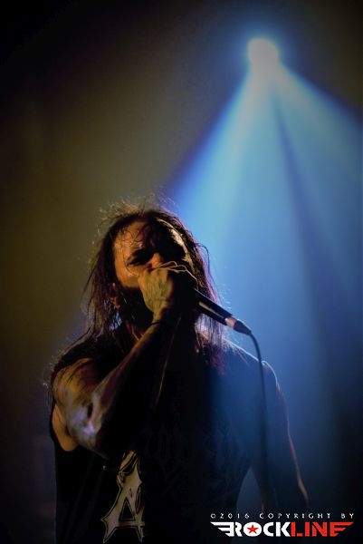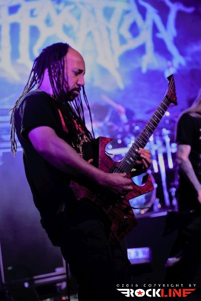 No in nastop skupine, ki je privabil največ pozornosti tega večera, ameriške legende tehničnega death metal pinorstva Suffocation. Ljudi se je nagnetlo dobrih tristo. Konkretno naukrjenih in nazobčanih. Temperaturo so dvigovali tudi nekateri ljubitelji težkih zvokov, ki so prispeli iz sosednje Hrvaške, bilo je tudi nekaj »izgubljenih in pozabljenih« Slovencev (to zato, ker vedno potujemo ločeno na koncerte v tujino) iz Štajerskega konca. Bend je dostavil nov vrhunski nastop v katerem je seveda pristopil v igri na polno in streljal z vso razpoložljivo artilerijo in z vseh položajev. Glede na to da je Frank Mullen, prvo grlo skupine, pred dnevi obrazložil, da zaradi službenih obvez zapušča Suffocaiton trajno, se pravi za nedoločen čas , se sedaj odpira vprašanje ali bo skupina na njegovo mesto integrirala kar dosedanjega občasnega koncertnega pomagača, ki je vstopil v četrto leto tovrstnega službovanja pri Suffocation. To je sicer bobnar skupne Disgorge Ricky Myers, ki je tudi tokrat dostavil s svojim prodornim growlom silno zgledno predstavo, vredno tega, da nosi Mullenove škornje. Bend se izjemno dobro drži ne glede na to, da je šel v zadnjem času skozi lep sveženj pretresov v postavi. To je potrdilo znova tudi izredno bobnarsko znanje in predstava novinca Erica Morottija, ki se je skupini priključil pred dvema letoma, kot zamenjava za izjemnega in v marsičem težko zamenljivega virtuoza »na kožah« Mikea Smitha. Če gremo v tej maniri dalje je v ekipi še en precej svež član. To je Charles Errigo, ki je prav tako sprva služboval pri skupini, kot začasna zamenjava za  preobremenjenega Guya Marchaisa, a so ga pred kratkim fantje priključili k redni postavi skupine. Tako je ob edinem originalnem članu skupine Terence Hobbsu, ki je seveda s Suffoation preživel vse hude in dobre čase, basist Derek Boyer, ki drgne bas kitaro pri Suffocation od leta 2004 dalje. Bend je v lanskem juniju izdal svoj skupno osmi studijski album »…Of the Dark Light«, s katerega je predstavil dve skladbi Return to the Abyss in Clarity Through Deprivation, ki skupaj z ne mnogo starejšo Pinnacle of Bedlam s prejšnjega albuma, uspešno vzdržuje visoko kakovostno reputacijo in razvpitost, ki jo je skupina zavoljo svoje komponistične širine ekstremnih tehnično kompleksnih brutalnih razgledov, prigarala skozi leta in jo uživa pri svojih fenih tudi na zrela leta delovanja.
