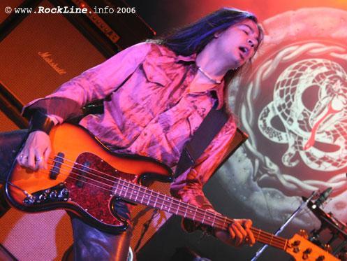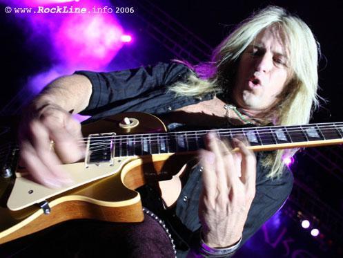 Vsekakor pa potem sledi umiritev tega bojnega plesa! Is This Love? Na končno! Sem stisnil Saksy k sebi, dotik ki sem ga med nastopom Whitesnake na Gods Of Metal tako pogrešal. Norišnica! Vsekakor “riffing” mnogo udarnejši, kot v originalu! Ljudje v refrenih še vedno ob Coverdaleu, ki se mu tak repertoar na kožo ne bi mogel bolje prilegati. Whitesnake je on! Itak, kaj sploh blebečem! Še en visoko adrenalinski napad z Ready And Willing, potem pa je na sceno stopil Doug Aldrich, ki je odprl prvo solo točko. Doug! To pot sem bil oddaljen v primerjavi s prvo vrsto koncerta Dio (Graz, 19.09.2002), a vseeno sem lahko opazoval dovolj dobro. Doug je neverjetno prepričljiv v takšni solo točki. Spet. V njo samega sebe in svoja čustva tako spretno vplete, da solaža izpade spontano, o tehnični perfekciji ni vredno zgubljati besed. A če pri tehnični dovršenosti obstanejo sicer mojstri Petrucci, Satriani, ipd in jih od tod ne premakneš, potem je Doug zgled kitarista, ki praši kitaro, da kitara v vsem sentimentu dobesedno oživi. Izgledalo je, da Doug še nikar bo odnehal “natepavati” kitare in vendar je napovedal Reba Beacha, ki je prisotpil mnogo bolj sofisticirano in večinoma brzel po sveltobno hitrem “taping-u” medtem, ko je Doug zasolil svojo solažo mnogo bolj bluesersko! Skratka, solaže so morda koga v avditoriju prikrajšale za kako Whitesnake klasiko več, a zame osebno so predstavljale enega vrhuncev koncerta. Fantje so znova skupaj na odru in se zlijejo skupni “jammming”. Hecno je bilo opazovati, medtem “skritega” za monitorji Coverdalea, ki ni in ni mogel stati pri miru med soliranjem kitaristov.
